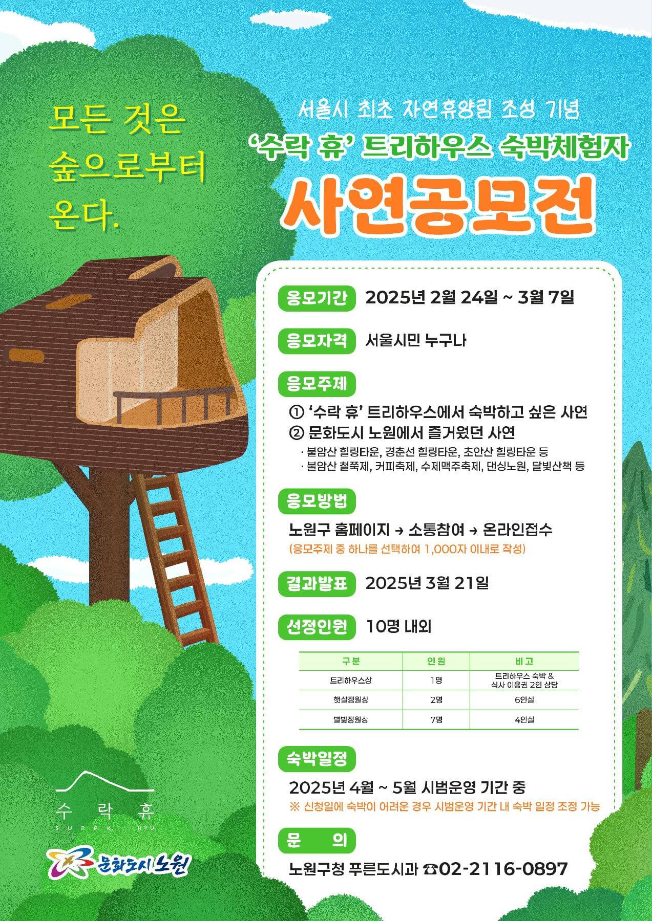서울 시민 누구나 노원구청 홈페이지를 통해 신청할 수 있습니다. 5월 정식 개장을 앞두고 사연 공모를 통해 희망자에게 숙박 체험 기회를 제공하기로 했으며, 응모 주제는 '수락 휴' 나무 위 호텔 트리하우스에서 숙박하고 싶은 사연, 문화도시 노원에서 즐거웠던 사연 등의 내용으로 창의적인 사연을 응모한 신청자 10팀을 선정합니다. 숙박 일정은 4월~5월 시범운영 기간 중 희망일에 숙박할 수 있습니다. 오승록 구청장은 수락 휴에 대해서 "자연과 문화가 일상 속에서 어우러지는 힐링도시 조성의 정점에 있는 사업"이라며 "<모든 것은 숲으로 부터 온다>는 말을 온몸으로 느끼고 공감하는 하루를 만끽하기 바란다."고 말했습니다.