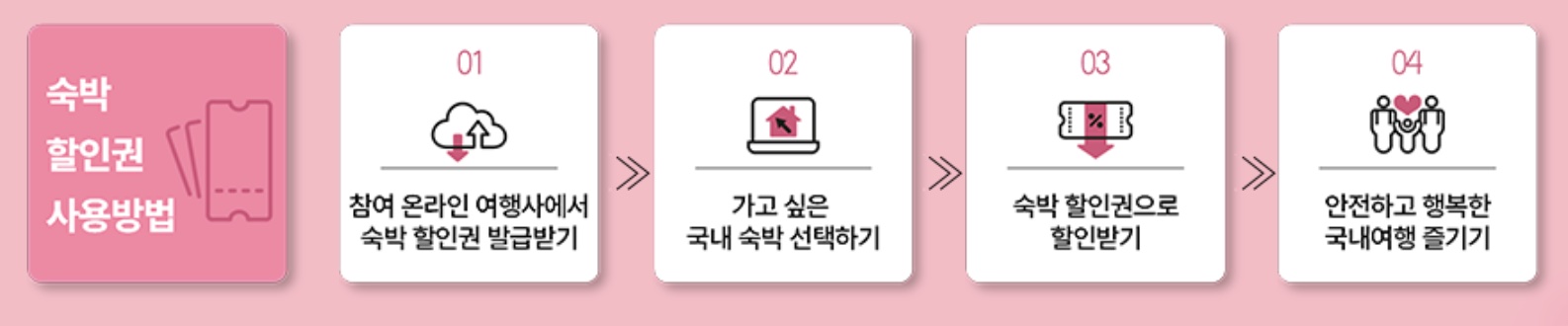 - 참여 온라인 여행사 싸이트에서 할인권 발급받은 후, 숙박 업소를 예약하고 결제시 할인권 적용하시면 됩니다.